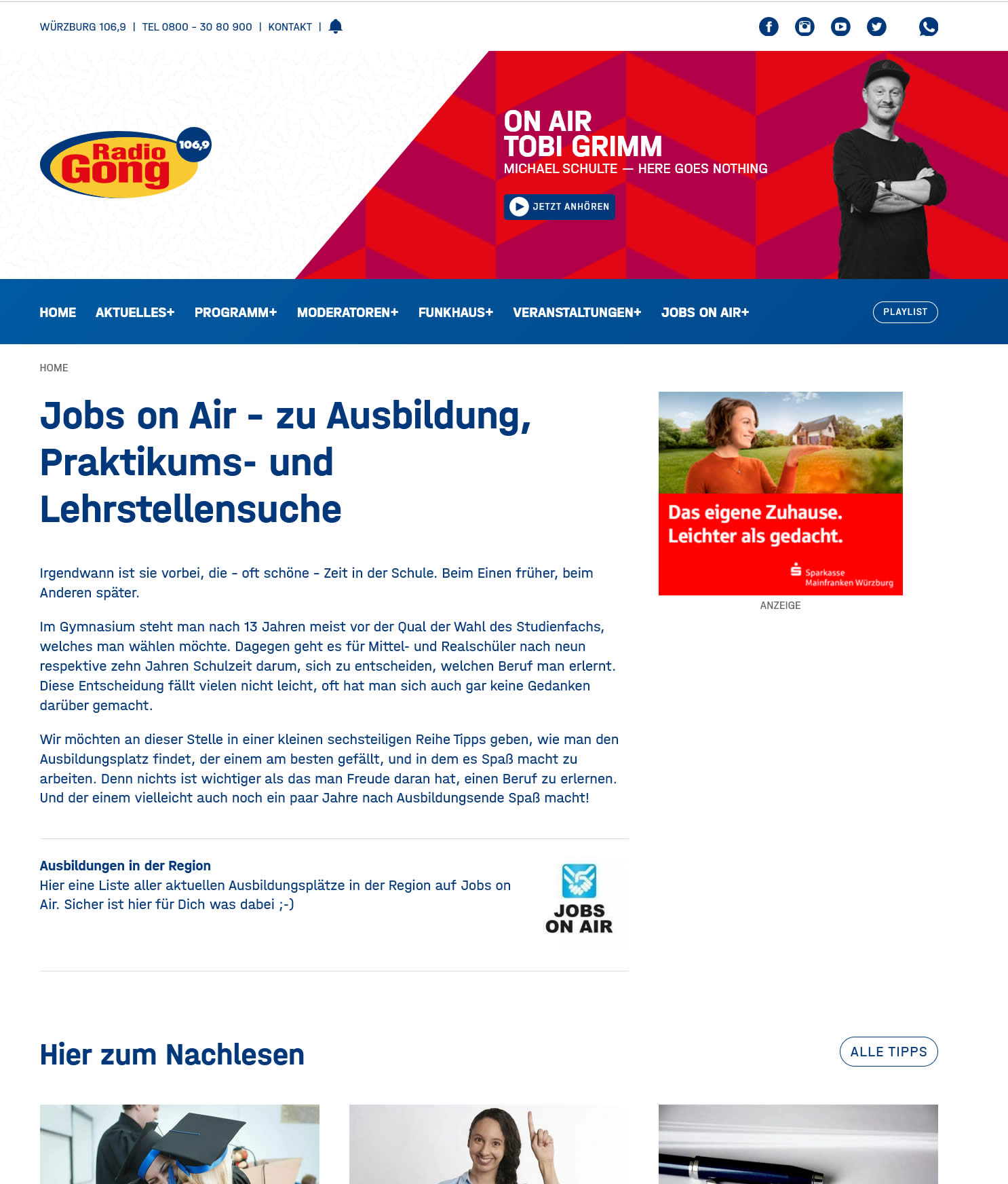 Unter „JOBS ON AIR – Starte Deine Zukunft jetzt!“ präsentiert das Funkhaus Würzburg einen weiteren Bereich seiner Online- und On-Air-Präsenz. Hier werden alle Bedürfnisse rund um das Thema Arbeit in der Region abgedeckt. Arbeitssuchende können sich unter der Rubrik „JOBS ON AIR“ der jeweiligen Seite Radio Gong, Radio Charivari und Mainfranken24 über regionale Arbeitgeber informieren und offene Stellenangebote, wie z.B. Vollzeitjobs, Minijobs, Ausbildungsplätze und Praktika finden.